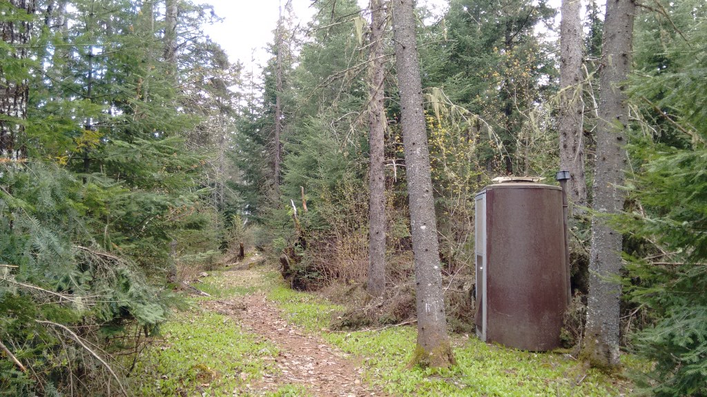 The path through the Lac-Saguay forest is sunk, it’s drunk … although the brown portaloo is intact on stable ground.