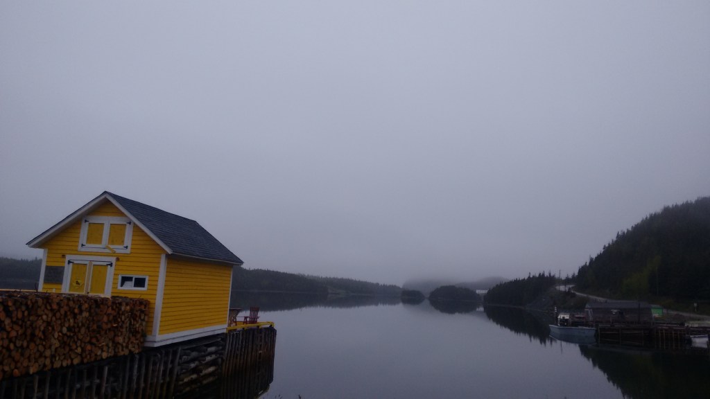 I dump my gear, and backtrack through the clouds and around multiple bays and inlets and coves to Harry’s Harbour, where logs get piled up neatly to gaze out over the water next to brightly-coloured sheds.