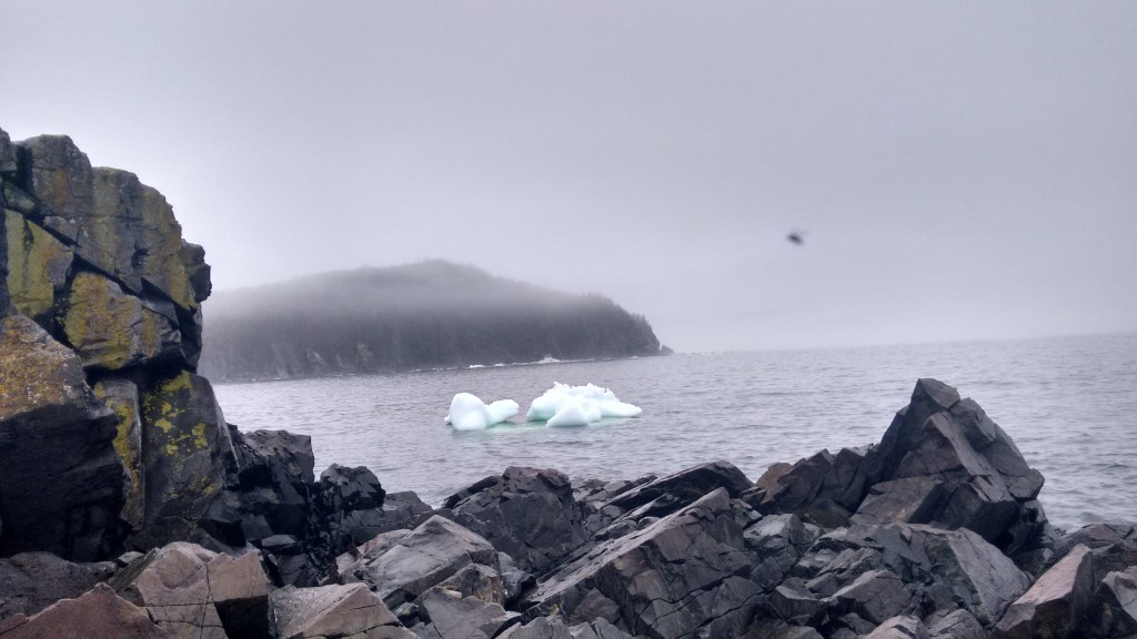 On an early-evening coastal hike, remnants of an iceberg, tipping itself over or dragging itself under I’m not sure which.