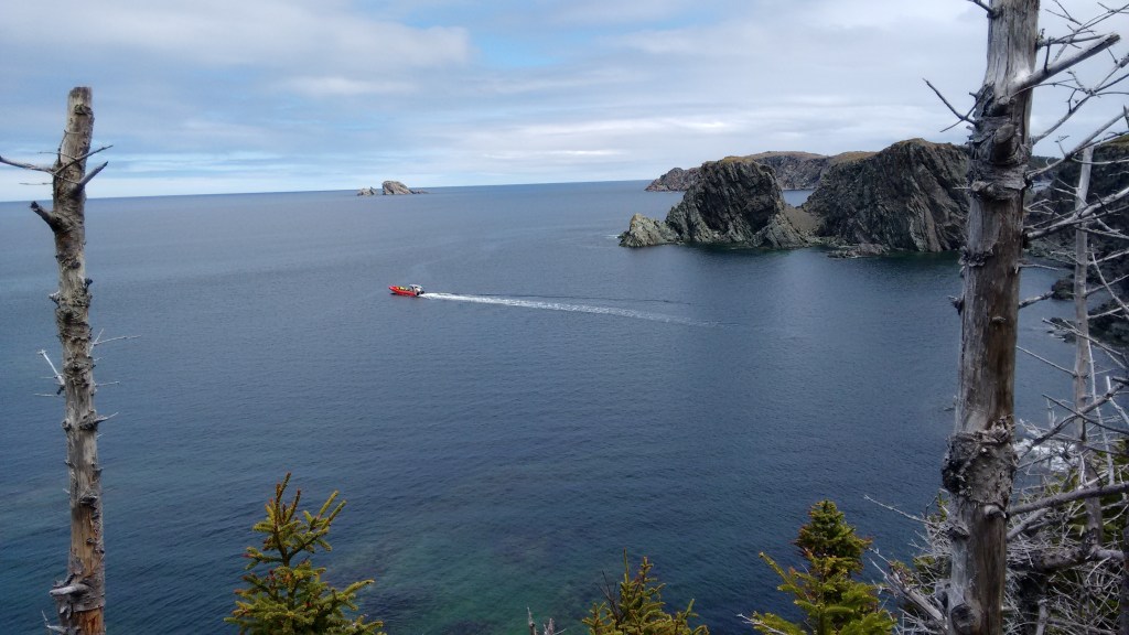 The peace and quiet of my early-morning hike hits the rocks abruptly at Long Point Lighthouse, where everyone who was staying overnight in and around Notre Dame Bay has now descended to. It’s a sold-out gig, this is.
