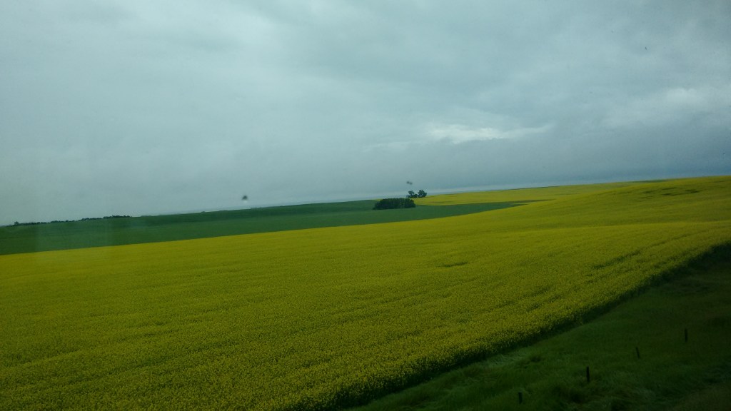 As we enter Saskatchewan, everyone seems to hit the snooze button as one; the alternately bright green and brighter yellow plains contrasting with a creeping sense of monotony, of life in a moving train passing through a dead flat landscape.