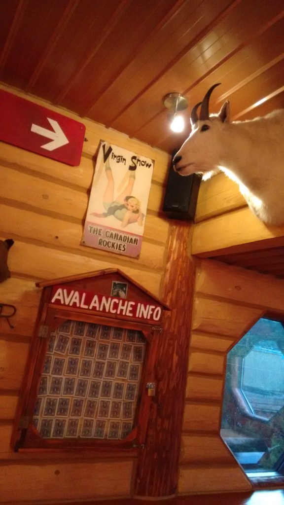 On the wall, avalanche info is a deck of tarot cards, locked up in a cabinet, beneath the virgin snow and the nosey mountain goat.