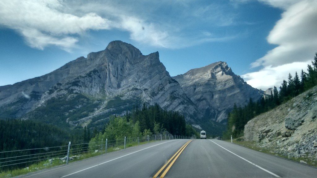 When I escape this, suddenly a joyously smooth ribbon of tarmac presents itself, with minimal traffic, incomprehensible scenery, bighorn sheep, imperfectly triangular peaks.