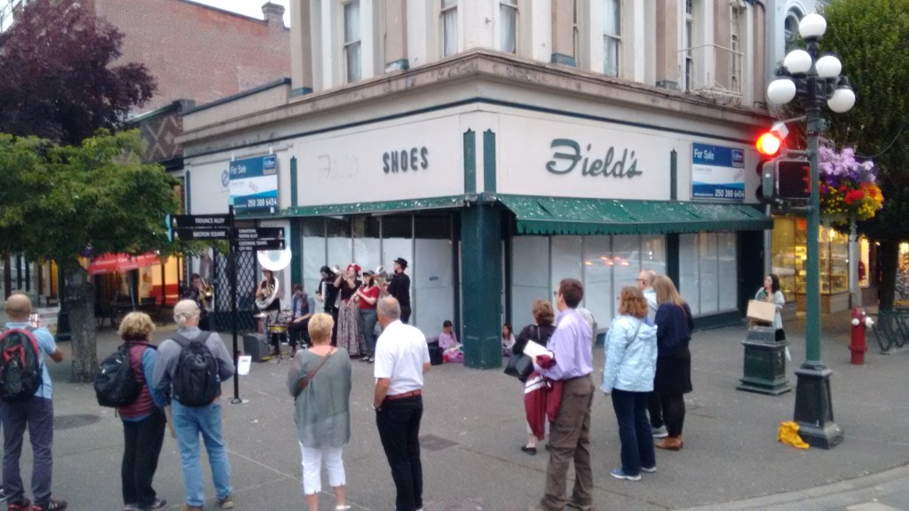 Outside, impromptu street music strikes up in front of the old shoe shop, early evening crowds gathered.