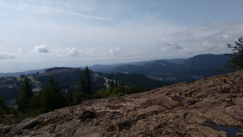 Hitting the trails at Goldstream Provincial Park, taking the difficult route up and around Mount Finlayson, passing multiple warning signs, to reach views out over lower peaks and towards the water, the straits around the island.
