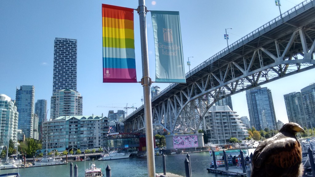 By lunchtime, I’m chowing down on a loaded bagel in the shadow of the Granville Bridge, immediately adjacent to a docile eagle.