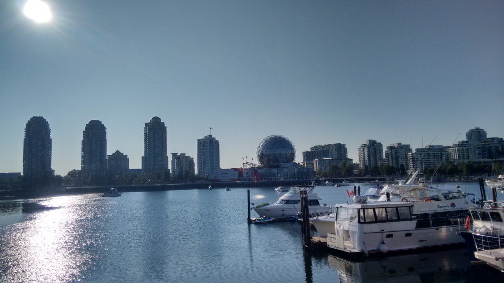 In False Creek: a spurious water-filled ditch, filled with expensive yachts and boats and cruisers (possibly); and joggers and cyclists and peelers and me, meandering around the bogus bay … getting in each other’s way.