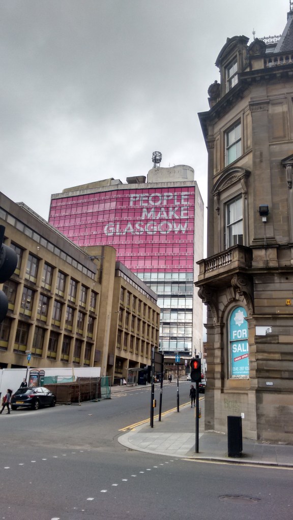 Upstairs is a city centre hotel, and a bedroom window overlooking the very best of Glaswegian brutalism.