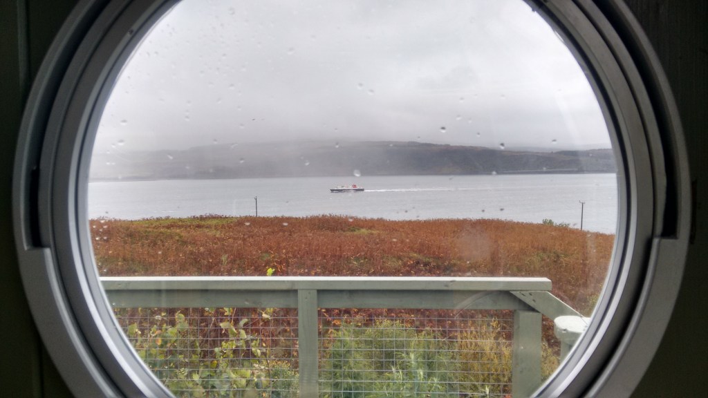Out on the sound, a Calmac ferry is going the wrong way, I swear. Slurping my tea, I wonder if someone has taken it for a joyride.