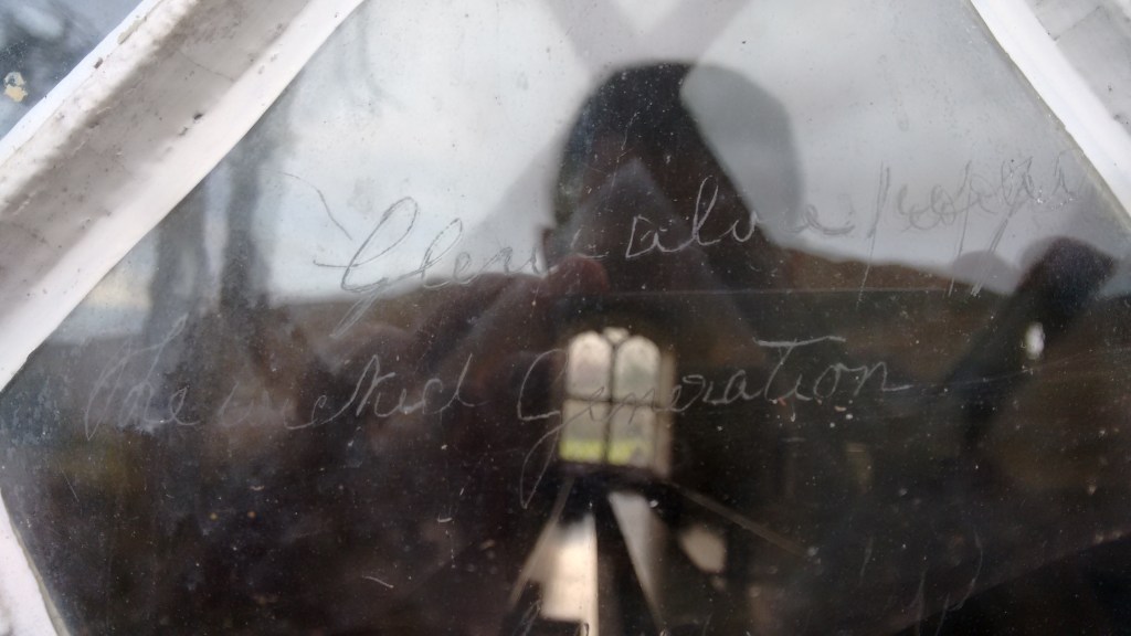 Time takes me backwards to Croick, an isolated hamlet where church windows have been repeatedly graffitied and scratched by the local folk from the 1800s: the Wicked Generation, the Glencalvie people.