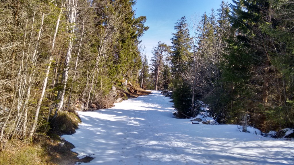 At a clearing, the unseen path through thick forest opens up to a ski run … and the weird thing is: I’m amazed to see people!